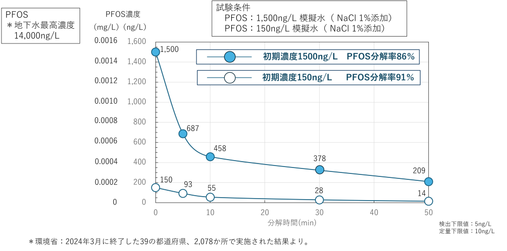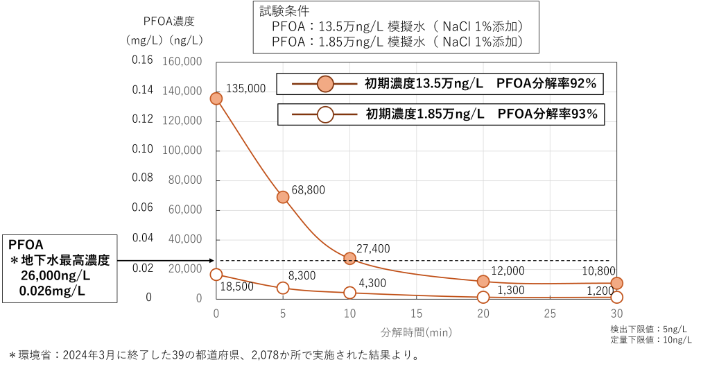 約5m3/日 アンモニア性窒素200mg/L→10mg/L以下へ処理する場合の条件となります。 |