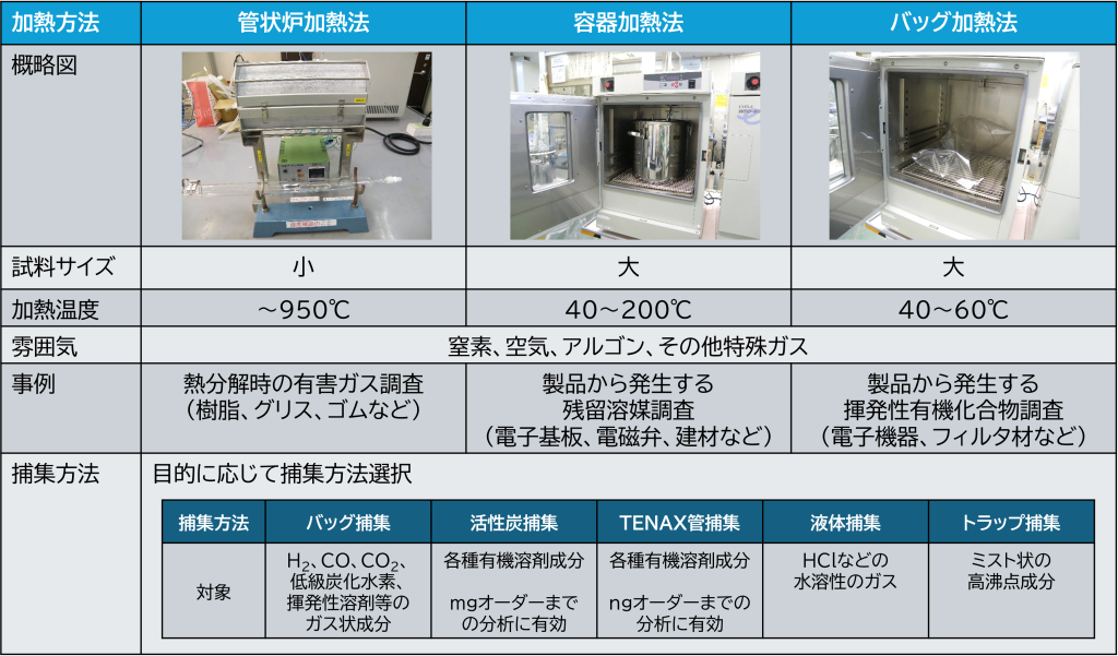 材料を加熱した時の発生するガス成分を、最適な方法で捕集して分析します。