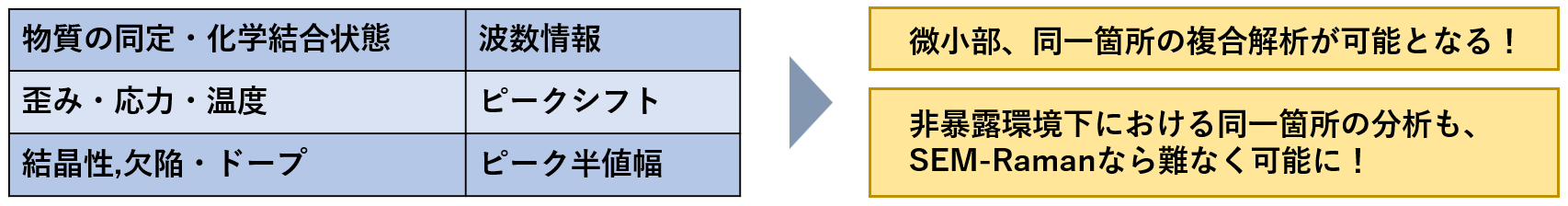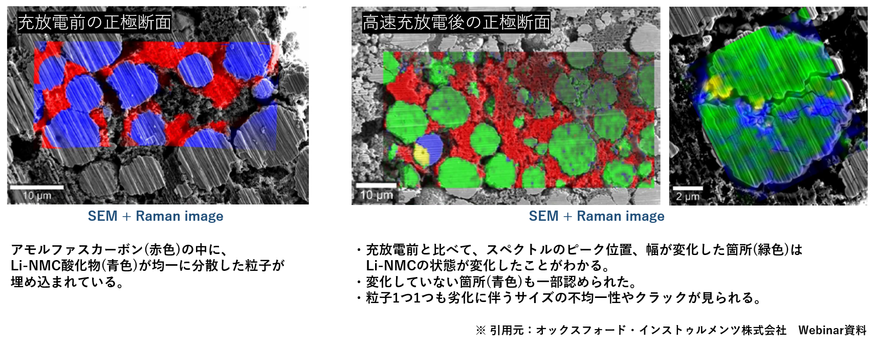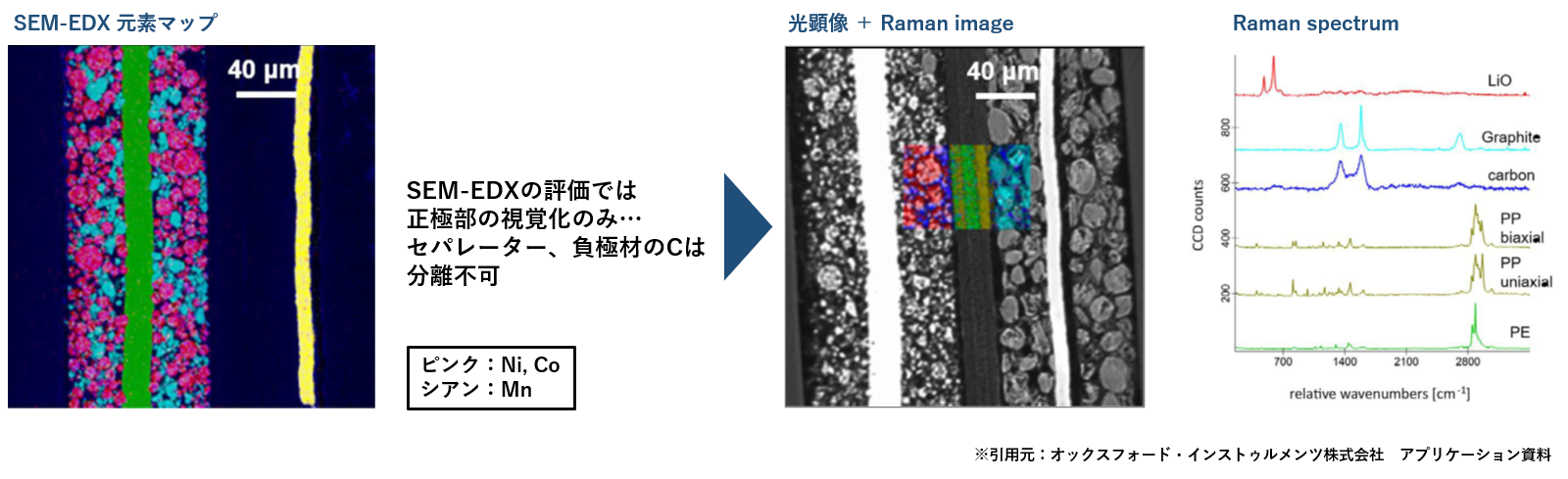 黒鉛などカーボン系材料の結晶性・欠陥密度・劣化状態評価において、SEMでの形態観察(粒子サイズ・クラック等)と、Ramanでの結晶性・欠陥評価を同一視野で実施可能。