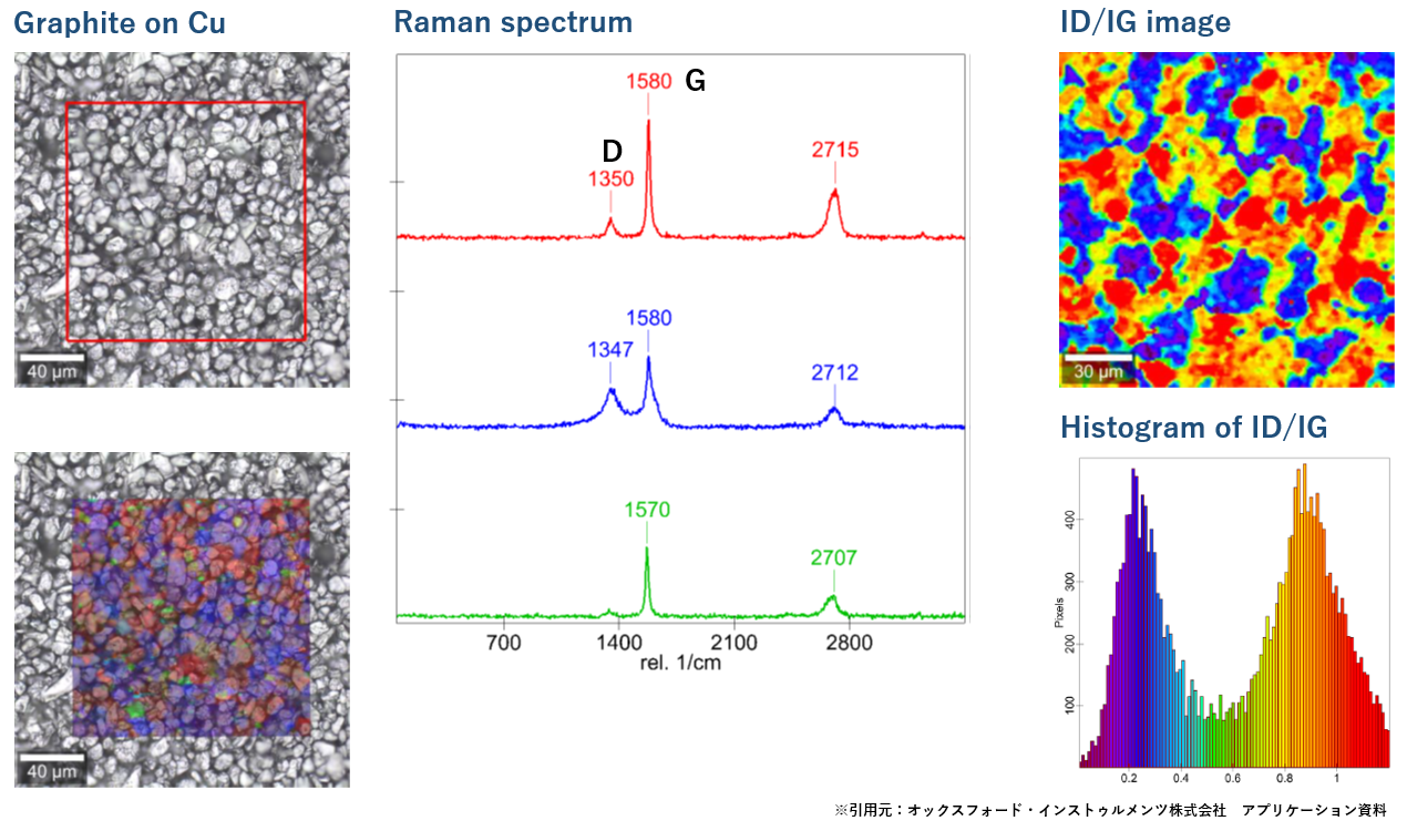 SEMによって劣化や異常が認められる領域を特定し、その視野でRaman測定を行うことで、結晶性(ID/IG比)の空間分布を可視化・評価します。